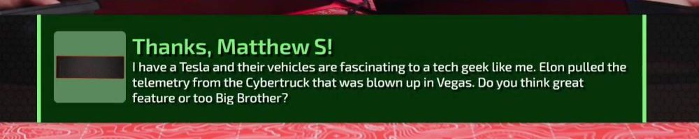 I have a Tesla and their vehicles are fascinating to a tech geek like me. Elon pulled the telemetry from the Cybertruck that was blown up in Vegas. Do you think great feature or too Big Brother?