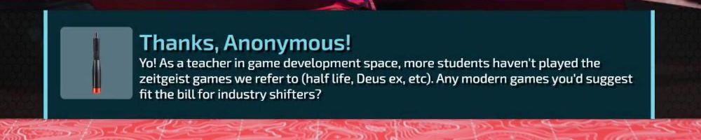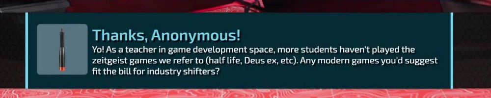 Yo! As a teacher in game development space, more students haven't played the zeitgeist games we refer to (half life, Deus ex, etc). Any modern games you'd suggest fit the bill for industry shifters?