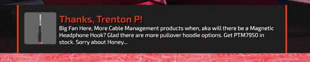 Big Fan Here, More Cable Management products when, aka will there be a Magnetic Headphone Hook? Glad there are more pullover hoodie options. Get PTM7950 in stock. Sorry about Honey...