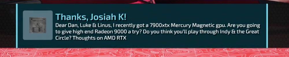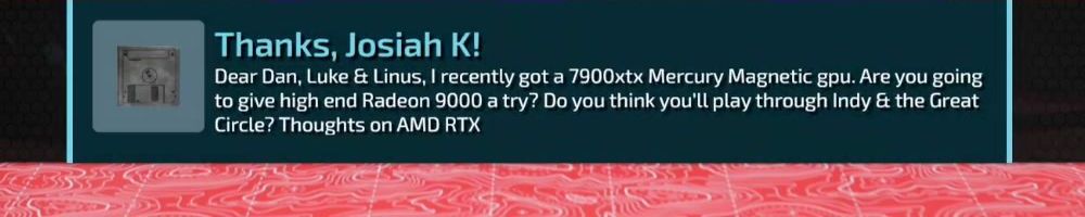 Dear Dan, Luke & Linus, I recently got a 7900xtx Mercury Magnetic gpu. Are you going to give high end Radeon 9000 a try? Do you think you'll play through Indy & the Great Circle? Thoughts on AMD RTX