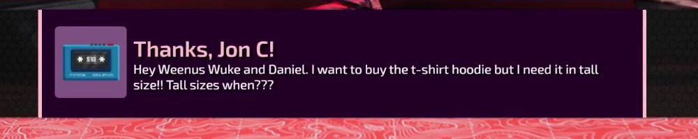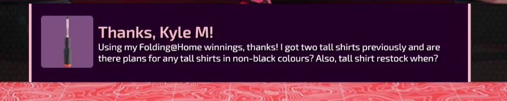 Using my Folding@Home winnings, thanks! I got two tall shirts previously and are there plans for any tall shirts in non-black colours? Also, tall shirt restock when?