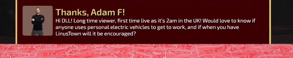 Hi DLL! Long time viewer, first time live as it's 2am in the UK! Would love to know if anyone uses personal electric vehicles to get to work, and if when you have LinusTown will it be encouraged?