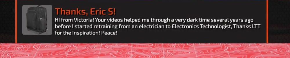 HI from Victoria! Your videos helped me through a very dark time several years ago before I started retraining from an electrician to Electronics Technologist, Thanks LTT for the Inspiration! Peace!