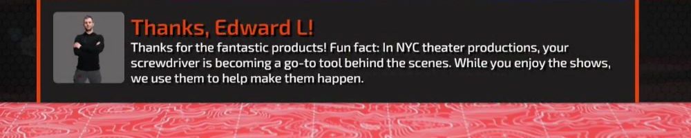 Thanks for the fantastic products! Fun fact: In NYC theater productions, your screwdriver is becoming a go-to tool behind the scenes. While you enjoy the shows, we use them to help make them happen.