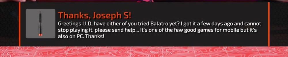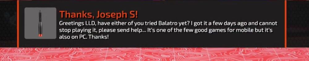 Greetings LLD, have either of you tried Balatro yet? I got it a few days ago and cannot stop playing it, please send help... It's one of the few good games for mobile but it's also on PC. Thanks!