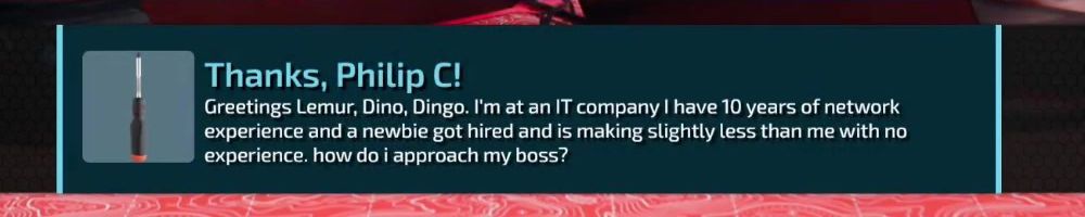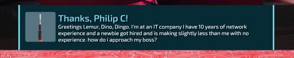Greetings Lemur, Dino, Dingo. I'm at an IT company I have 10 years of network experience and a newbie got hired and is making slightly less than me with no experience. how do i approach my boss?