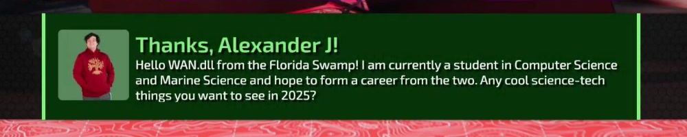 Hello WAN.dLL from the Florida Swamp! I am currently a student in Computer Science and Marine Science and hope to form a career from the two. Any cool science-tech things you want to see in 2025?