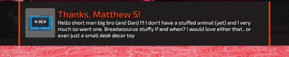 Hello short man big bro (and Dan) !!! I don't have a stuffed animal (yet) and I very much so want one. Breadasourus stuffy if and when? I would love either that.. or even just a small desk decor toy