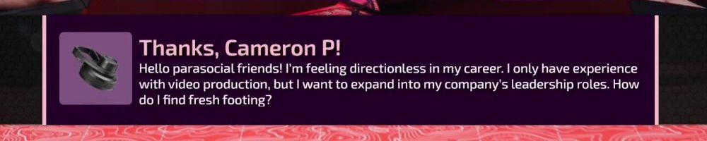 Hello parasocial friends! I'm feeling directionless in my career. I only have experience with video production, but I want to expand into my company's leadership roles. How do I find fresh footing?