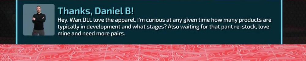 Hey, Wan.DLL love the apparel, I'm curious at any given time how many products are typically in development and what stages? Also waiting for that pant re-stock, love mine and need more pairs.