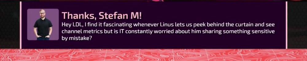 Hey LDL, I find it fascinating whenever Linus lets us peek behind the curtain and see channel metrics but is IT constantly worried about him sharing something sensitive by mistake?