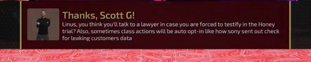 Linus, you think you'll talk to a lawyer in case you are forced to testify in the Honey trial? Also, sometimes class actions will be auto opt-in like how sony sent out check for leaking customers data