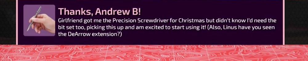 Girlfriend got me the Precision Screwdriver for Christmas but didn't know I'd need the bit set too, picking this up and am excited to start using it! (Also, Linus have you seen the DeArrow extension?)