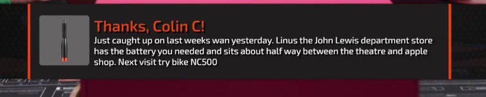 Thanks, Colin C! Just caught up on last weeks wan yesterday. Linus the John Lewis department store has the battery you needed and sits about half way between the theatre and apple shop. Next visit try bike NC500