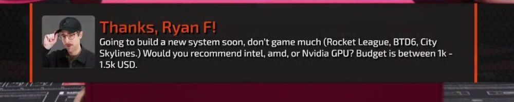 Thanks, Ryan F! Going to build a new system soon, don't game much (Rocket League, BTD6, City Skylines.) Would you recommend intel, amd, or Nvidia GPU? Budget is between 1k - 1.5k USD.