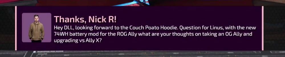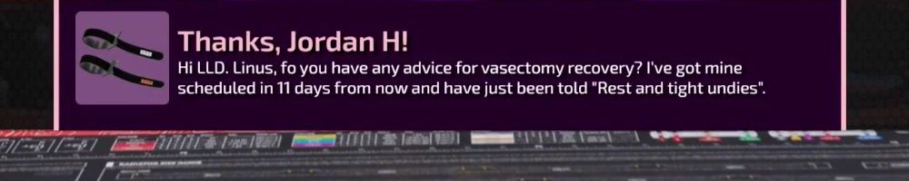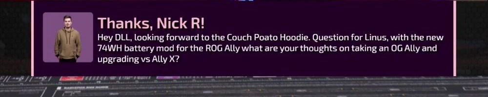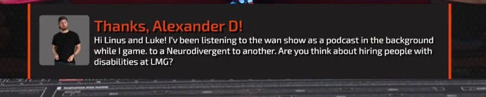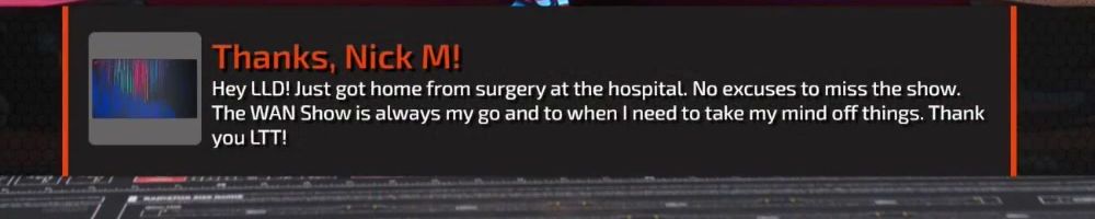 Thanks, Nick M! Hey LLD! Just got home from surgery at the hospital. No excuses to miss the show. The WAN Show is always my go and to when I need to take my mind off things. Thank you LTT!