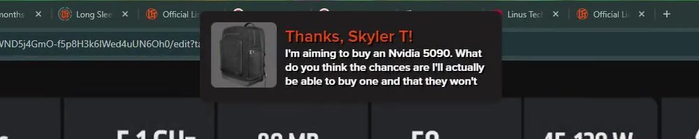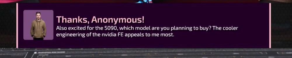 Thanks, Anonymous! Hi DLL! Linus - Which 5090 are you planning on getting? As cool as the founder card is, it's hard for me to ignore the benefits of having a card from a partner for better cooling or better performance