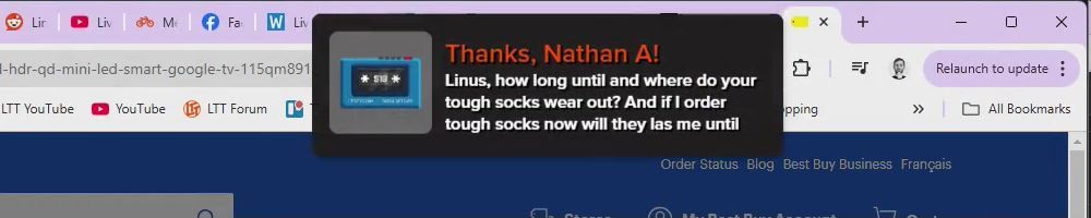 Thanks, Nathan A! Linus, how long until and where do your tough socks wear out? And if I order tough socks now will they las me until the LTT Socks are released?