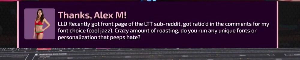 Thanks, Alex M! LLD Recently got front page of the LTT sub-reddit, got ratio'd in the comments for my font choice (cool jazz). Crazy amount of roasting, do you run any unique fonts or personalization that peeps hate?