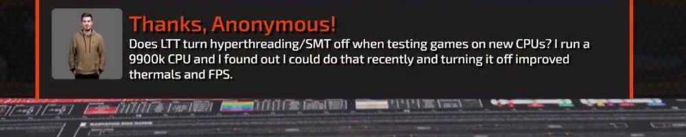 Thanks, Anonymous! Does LTT turn hyperthreading/SMT off when testing games on new CPUs? I run a 9900k CPU and I found out I could do that recently and turning it off improved thermals and FPS.