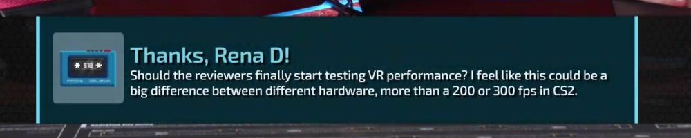 Thanks, Rena D! Should the reviewers finally start testing VR performance? I feel like this could be a big difference between different hardware, more than a 200 or 300 fps in CS2.