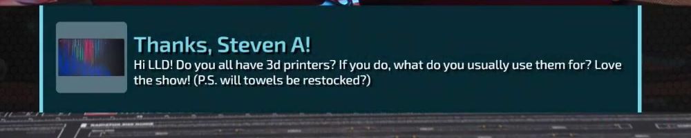 Thanks, Steven A! Hi LLD! Do you all have 3d printers? If you do, what do you usually use them for? Love the show! (P.S. will towels be restocked?)