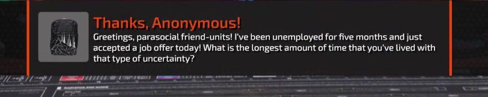 Thanks, Anonymous! Greetings, parasocial friend-units! I've been unemployed for five months and just accepted a job offer today! What is the longest amount of time that you've lived with that type of uncertainty?