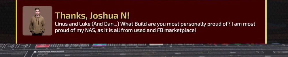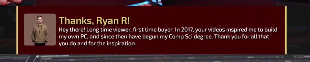 Thanks, Ryan R! Hey there! Long time viewer, first time buyer. In 2017, your videos inspired me to build my own PC, and since then have begun my Comp Sci degree. Thank you for all that you do and for the inspiration.