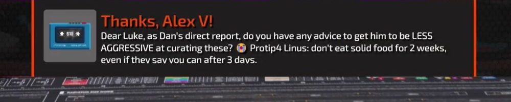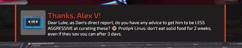 Thanks, Alex V! Dear Luke, as Dan's direct report, do you have any advice to get him to be LESS AGGRESSIVE at curating these? 🤔 Protip4 Linus: don't eat solid food for 2 weeks, even if they say you can after 3 days.