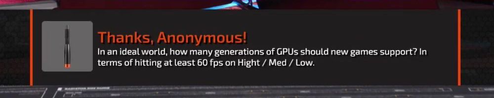 Thanks, Anonymous! In an ideal world, how many generations of GPUs should new games support? In terms of hitting at least 60 fps on Hight / Med / Low.