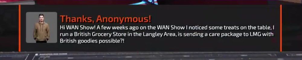 Thanks, Anonymous! Hi WAN Show! A few weeks ago on the WAN Show I noticed some treats on the table, I run a British Grocery Store in the Langley Area, is sending a care package to LMG with British goodies possible?!