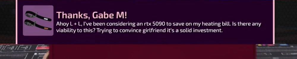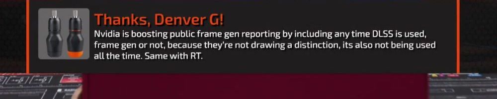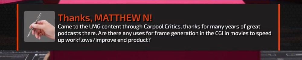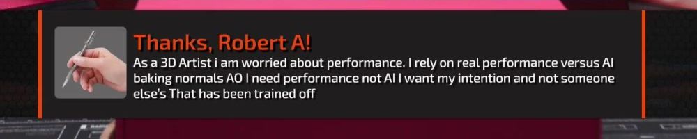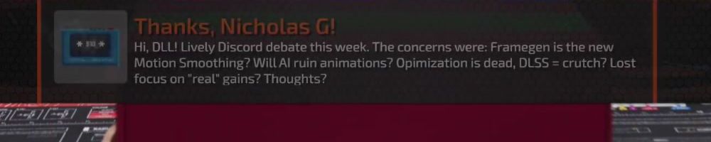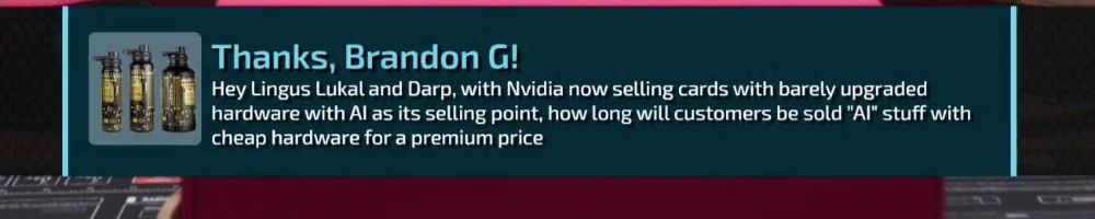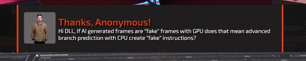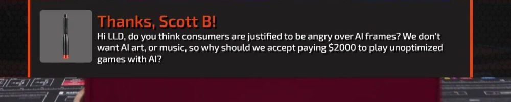 Thanks, Scott B! Hi LLD, do you think consumers are justified to be angry over AI frames? We don't want AI art, or music, so why should we accept paying $2000 to play unoptimized games with AI?