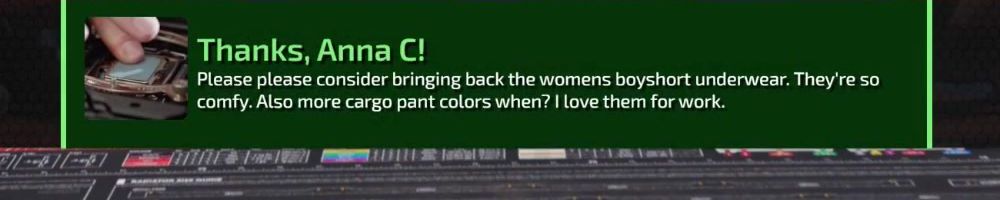 Thanks, Anna C! Please please consider bringing back the womens boyshort underwear. They're so comfy. Also more cargo pant colors when? I love them for work.