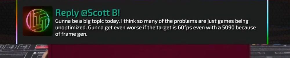 Reply @Scott B! Gunna be a big topic today. I think so many of the problems are just games being unoptimized. Gunna get even worse if the target is 60fps even with a 5090 because of frame gen.