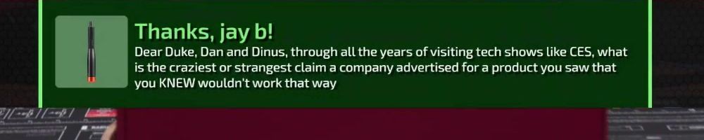 Thanks, jay b! Dear Duke, Dan and Dinus, through all the years of visiting tech shows like CES, what is the craziest or strangest claim a company advertised for a product you saw that you KNEW wouldn't work that way