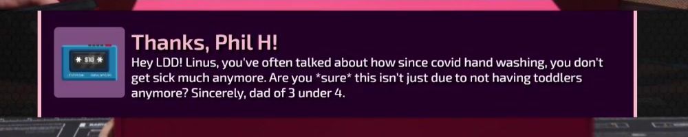 Thanks, Phil H! Hey LDD! Linus, you've often talked about how since covid hand washing, you don't get sick much anymore. Are you *sure* this isn't just due to not having toddlers anymore? Sincerely, dad of 3 under 4.