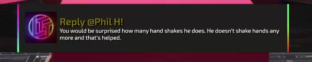 Reply @Phil H! You would be surprised how many hand shakes he does. He doesn't shake hands any more and that's helped.