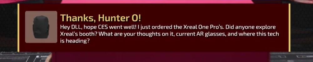 Thanks, Hunter O! Hey DLL, hope CES went well! I just ordered the Xreal One Pro's. Did anyone explore Xreal's booth? What are your thoughts on it, current AR glasses, and where this tech is heading?