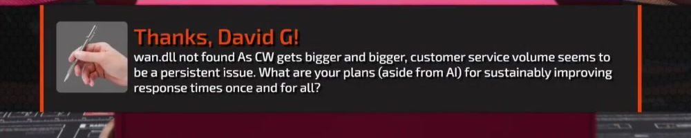 Thanks, David G! wan.dll not found As CW gets bigger and bigger, customer service volume seems to be a persistent issue. What are your plans (aside from AI) for sustainably improving response times once and for all?