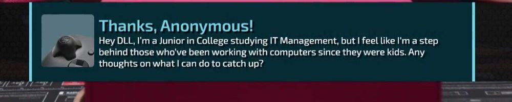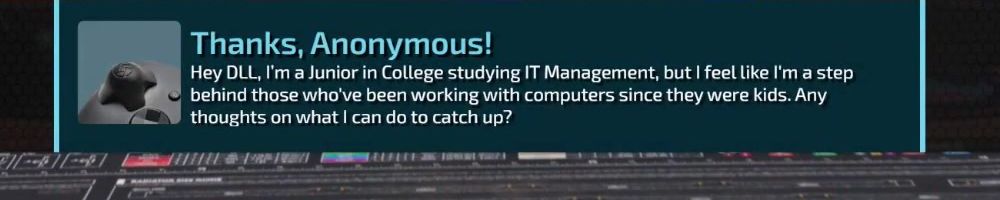 Thanks, Anonymous! Hey DLL, I'm a Junior in College studying IT Management, but I feel like I'm a step behind those who've been working with computers since they were kids. Any thoughts on what I can do to catch up?