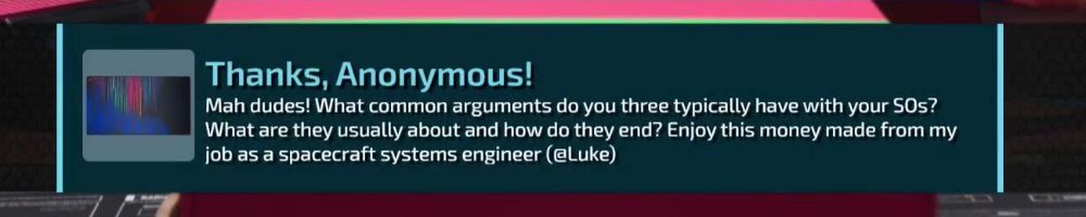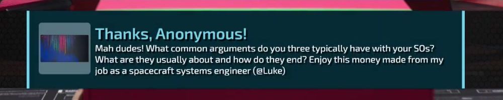 Thanks, Anonymous! Mah dudes! What common arguments do you three typically have with your SOs? What are they usually about and how do they end? Enjoy this money made from my job as a spacecraft systems engineer (@Luke)