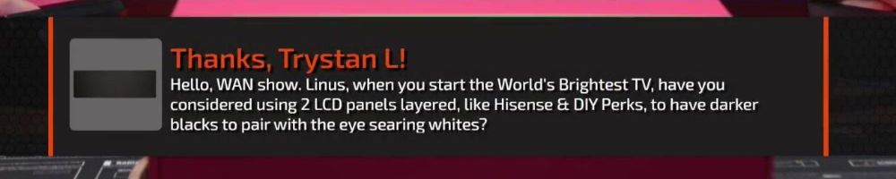 Thanks, Trystan L! Hello, WAN show. Linus, when you start the World's Brightest TV, have you considered using 2 LCD panels layered, like Hisense & DIY Perks, to have darker blacks to pair with the eye searing whites?