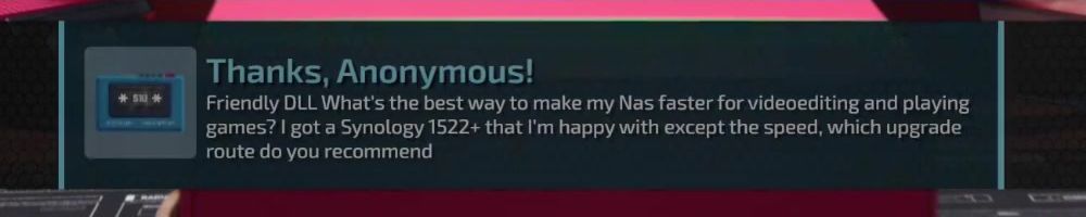 Thanks, Anonymous! Friendly DLL What's the best way to make my Nas faster for videoediting and playing games? I got a Synology 1522+ that I'm happy with except the speed, which upgrade route do you recommend