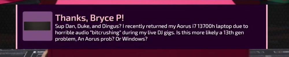 Thanks, Bryce P! Sup Dan, Duke, and Dingus? I recently returned my Aorus i7 13700h laptop due to horrible audio "bitcrushing" during my live DJ gigs. Is this more likely a 13th gen problem, An Aorus prob? Or Windows?