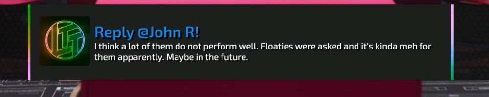 Reply @John R! I think a lot of them do not perform well. Floaties were asked and it's kinda meh for them apparently. Maybe in the future.