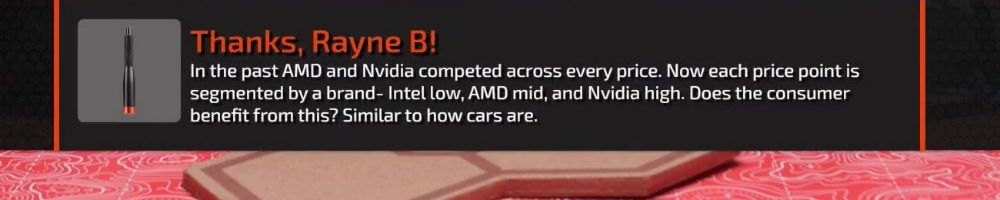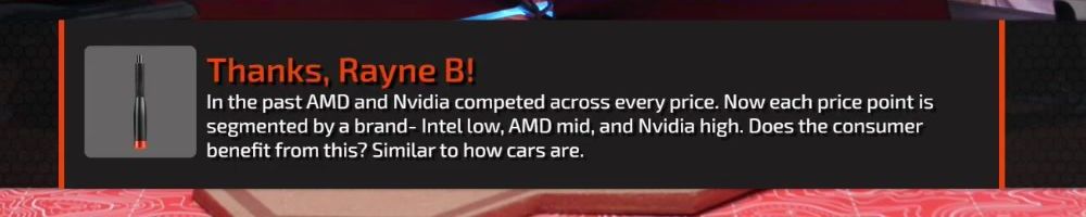 Thanks, Rayne B! In the past AMD and Nvidia competed across every price. Now each price point is segmented by a brand- Intel low, AMD mid, and Nvidia high. Does the consumer benefit from this? Similar to how cars are.