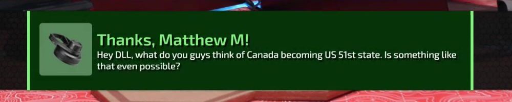 Thanks, Matthew M! Hey DLL, what do you guys think of Canada becoming US 51st state. Is something like that even possible?