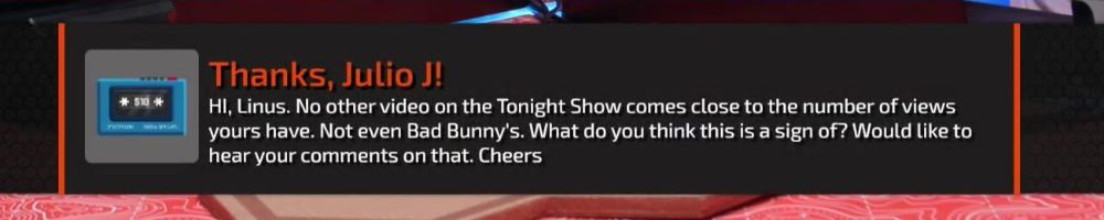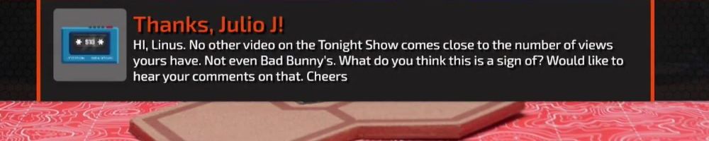 Thanks, Julio J! Hi, Linus. No other video on the Tonight Show comes close to the number of views yours have. Not even Bad Bunny's. What do you think this is a sign of? Would like to hear your comments on that. Cheers