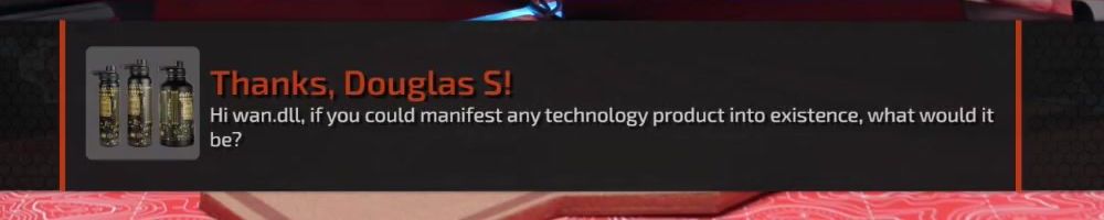 Thanks, Douglas S! Hi wan.dll, if you could manifest any technology product into existence, what would it be?