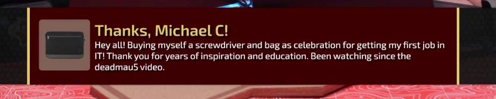 Thanks, Michael C! Hey all! Buying myself a screwdriver and bag as celebration for getting my first job in IT! Thank you for years of inspiration and education. Been watching since the deadmau5 video.